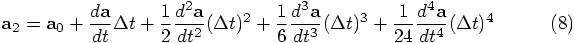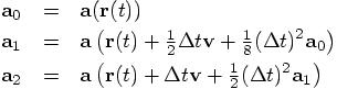 To start with, let us look at your variable a2, which is the acceleration after a time step dt, starting from an initial acceleration a0. A Taylor expansion can approximate a2 as: