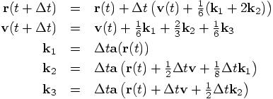 def rk4(dt) old_pos = pos a0 = acc @pos = old_pos + vel*0.5*dt + a0*0.125*dt*dt a1 = acc @pos = old_pos + vel*dt + a1*0.5*dt*dt a2 = acc @pos = old_pos + vel*dt + (a0+a1*2)*(1/6.0)*dt*dt @vel = vel + (a0+a1*4+a2)*(1/6.0)*dt end