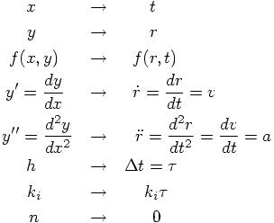 How about the following translation, where the position r, velocity v, and a are all scalar quantities, since we are considering an effectively one-dimensional problem: